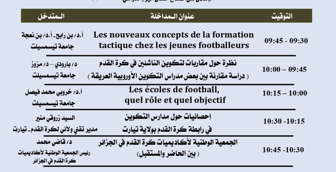 نظمت يوم 2025-02-23 يومًا دراسيًا، تحت عنوان: “مدارس التكوين في كرة القدم: الواقع والتحديات”، بمشاركة نخبة من الأساتذة الباحثين، مدربين ومؤطرين لبعض مدارس كرة القدم التابعين لمديرية الشباب والرياضة لولاية تيسمسيلت، إطار من مديرية الشباب والرياضة لولاية تيارت ( مدير فني ولائي)، رئيس الجمعية الوطنية لأكاديمات كرة القدم بالجزائر، وبحضور طلبة تخصص كرة القدم بالمعهد.