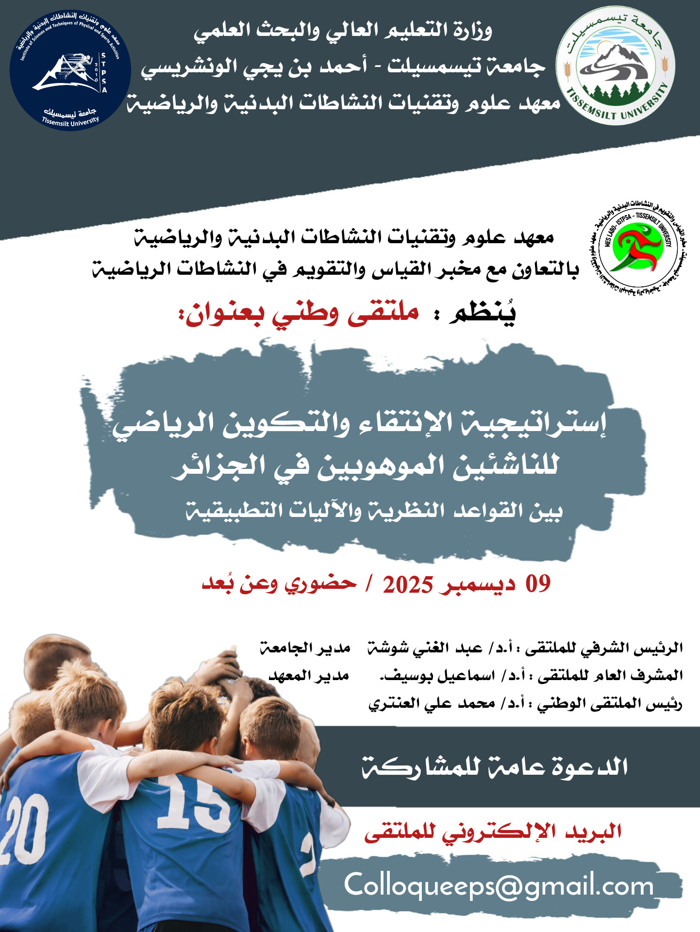 إعلان عن ملتقى وطني : إستراتيجية الانتقاء والتكوين الرياضي للناشئين الموهوبين في الجزائر القواعد النظرية والآليات التطبيقية. المزمع عقده يوم 09 ديسمبر2025