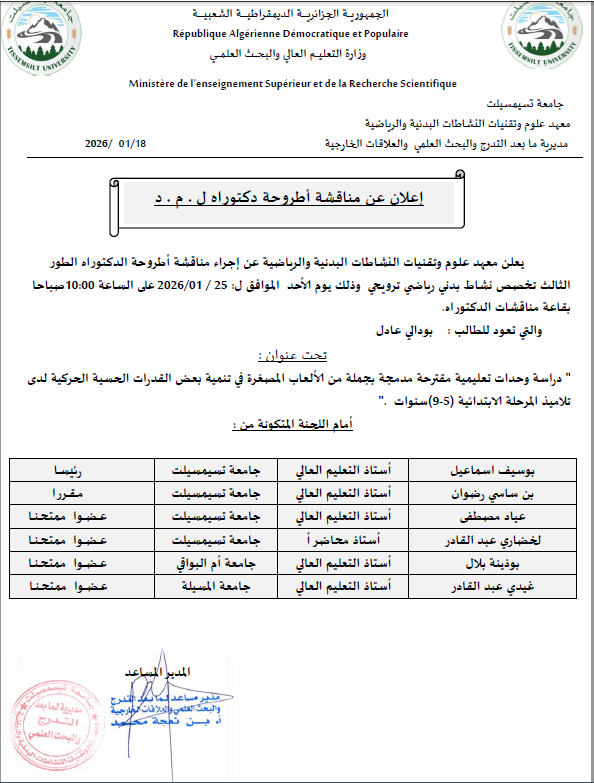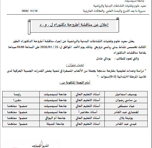 إعلان عن مناقشة أطروحة دكتوراه للطالب بودالي عادل @إعلانات لطلبة الدكتوراه@مناقشات أطروحة الدكتوراه بواسطة admin institut STAPS آخر تحديث يناير 19, 2026 287 شارك يعلن معهد علوم وتقنيات النشاطات البدنية والرياضية عن إجراء مناقشة أطروحة الدكتوراه. -الطور الثالث للطالب : ببودالي عادل. 287 شارك FacebookTwitterGoogle+ReddItWhatsAppPinterestالبريد الإلكتروني