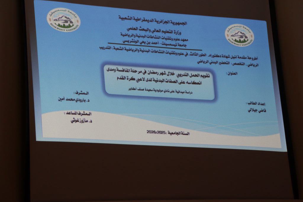 تم صباح اليوم بالمعهد، مناقشة أطروحة دكتوراه في شعبة التدريب الرياضي، تخصص التحضير البدني الرياضي للطالب الباحث #قاضي_جيلالي، والموسومة بعنوان : تقويم الحمل التدريبي خلال شهر رمضان في مرحلة المنافسة ومدى انعكاسه على الصفات البدنية لدى لاعبي كرة القدم.