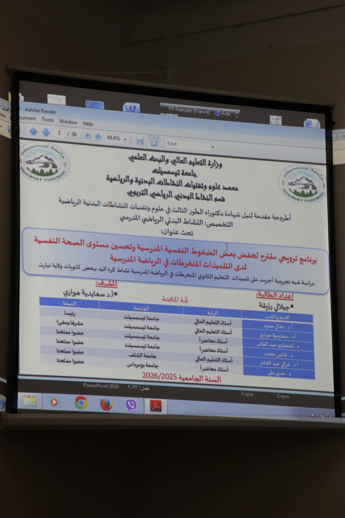 تم صباح هذا اليوم بقاعة المناقشات في المعهد، مناقشة أطروحة دكتوراه في تخصص النشاط البدني الرياضي المدرسي #للطالبة_جيلالي_رزيقة، وبعد المناقشة العلنية والمداولات السرية، تم منح شهادة الدكتوراه للطالبة بتقدير #مشرف_جدا.