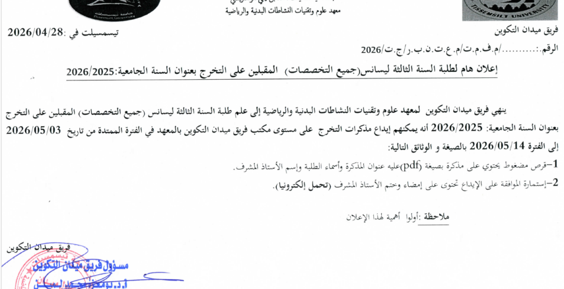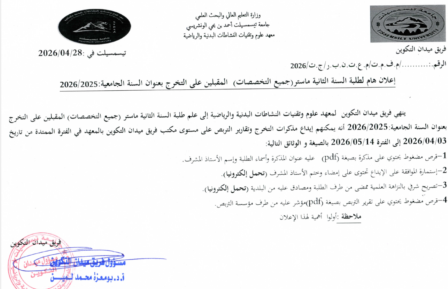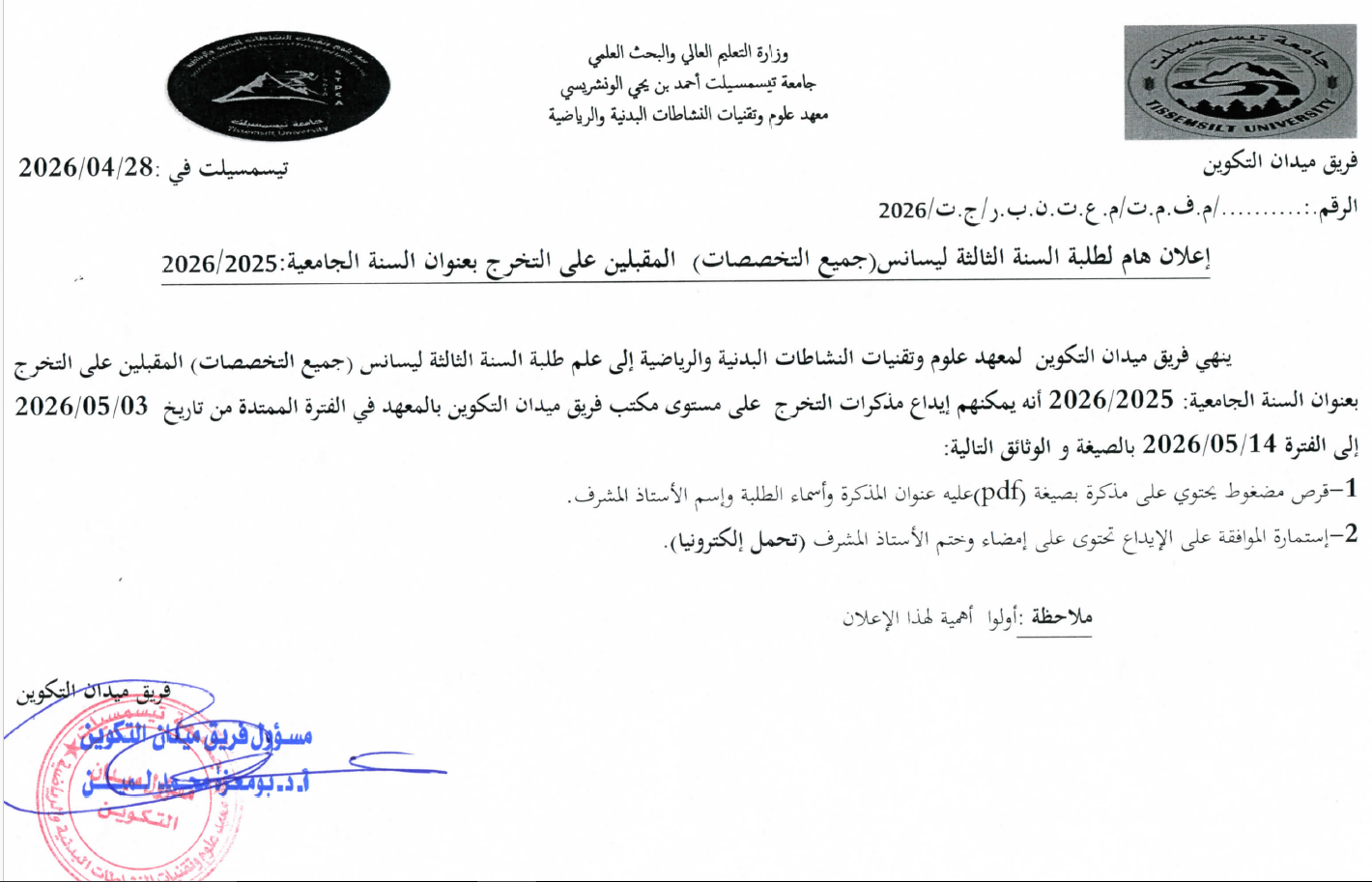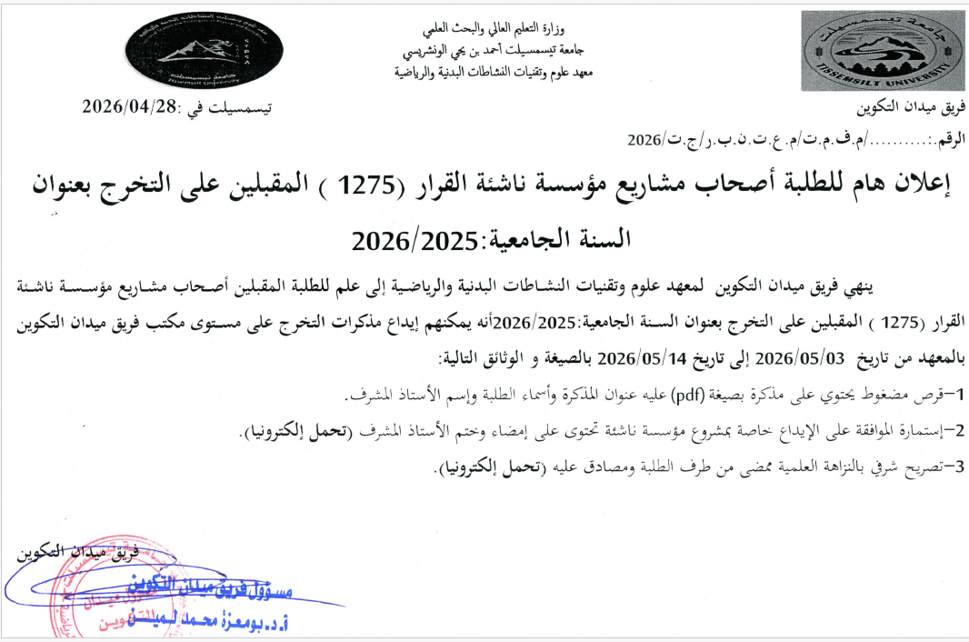 اعلان هام لطلبة السنة الثالثة ليسانس-الثانية ماستر-أصحاب مشاريع مؤسسة ناشئة القرار 1275 @إعلانات للطلبةإعلان مهم بواسطة admin institut STAPS في أبريل 28, 2026 2 شارك إعلان خاص بإيداع مذكرة التخرج و التربص الميداني -إستمارة الموافقة على إيداع مذكرة التخرج-الثالثة ليسانس التحميل من هنا -إستمارة الموافقة على إيداع مذكرة التخرج-الثانية ماستر التحميل من هنا -تصريح شرفي بالإلتزام بقواعد النزاهة العلمية-الثانية ماستر التحميل من هنا -تقرير حول قابلية المذكزة-مشروع نهاية الدراسة في إطارالقرار1275 التحميل من هنا -تصريح شرفي بالإلتزام بقواعد النزاهة العلمية-مشروع نهاية الدراسة في إطارالقرار 1275 التحميل من هنا 2 شارك FacebookTwitterGoogle+ReddItWhatsAppPinterestالبريد الإلكتروني